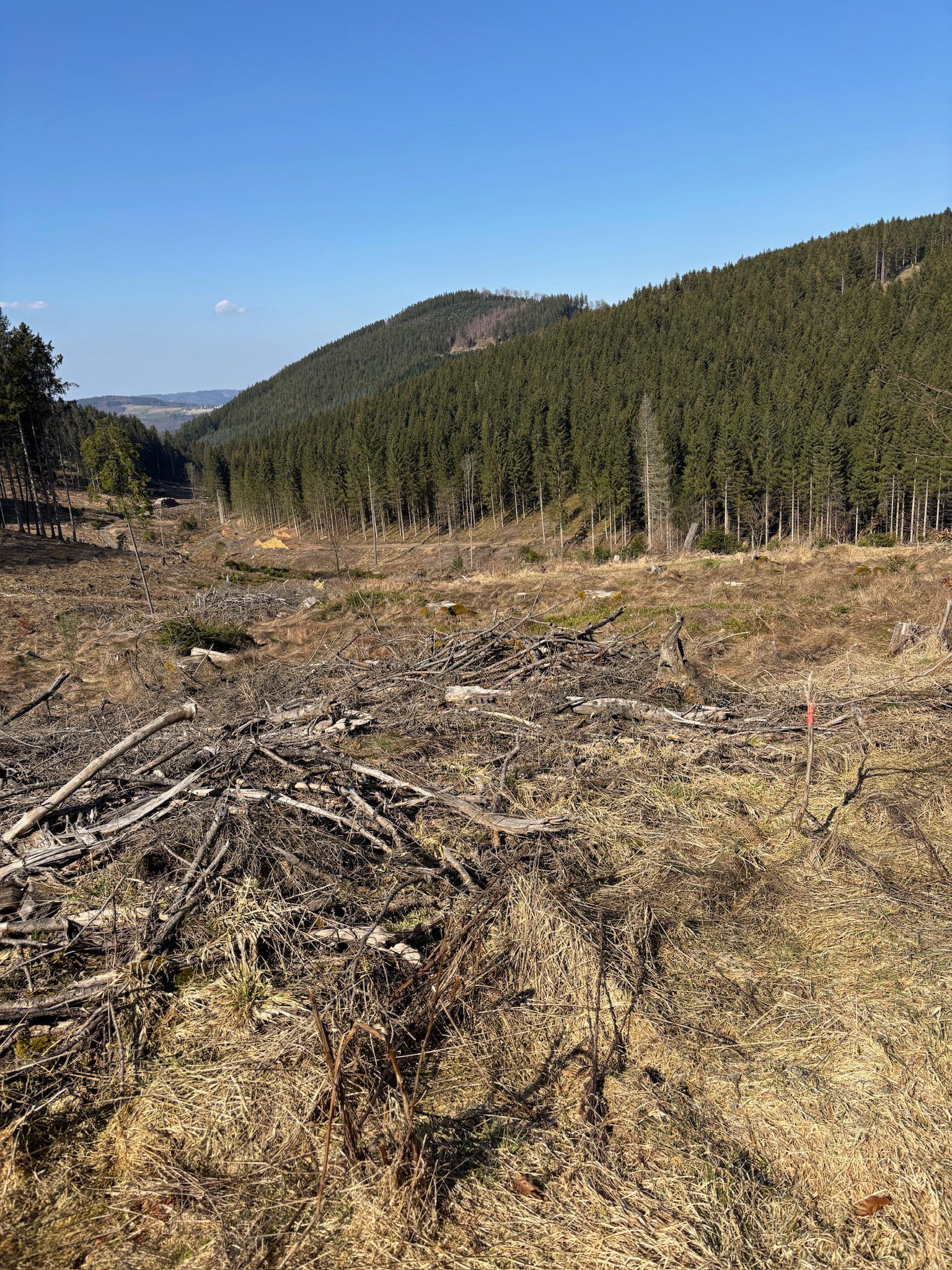 The central objective is the development of climate-resilient mixed forests. Monostructured conifer stands are converted into near-natural, structurally diverse forests to improve resistance to drought and storms. At the same time, timber reserves are systematically increased to maximize CO₂ sink performance. Deadwood, habitat trees, and wet areas are deliberately preserved as habitats to strengthen ecological resilience.